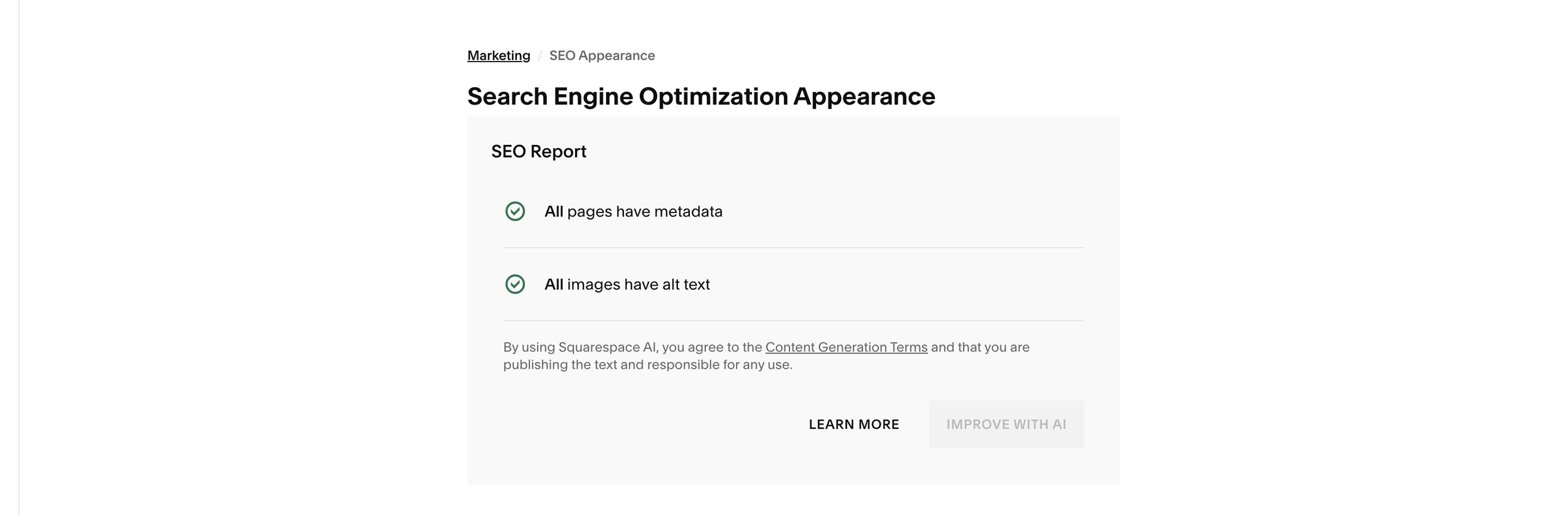 To find the SEO panel, go to your site’s settings->marketing->SEO appearance. You’ll see an SEO report with a button to Improve with AI. Here’s what you’ll find: